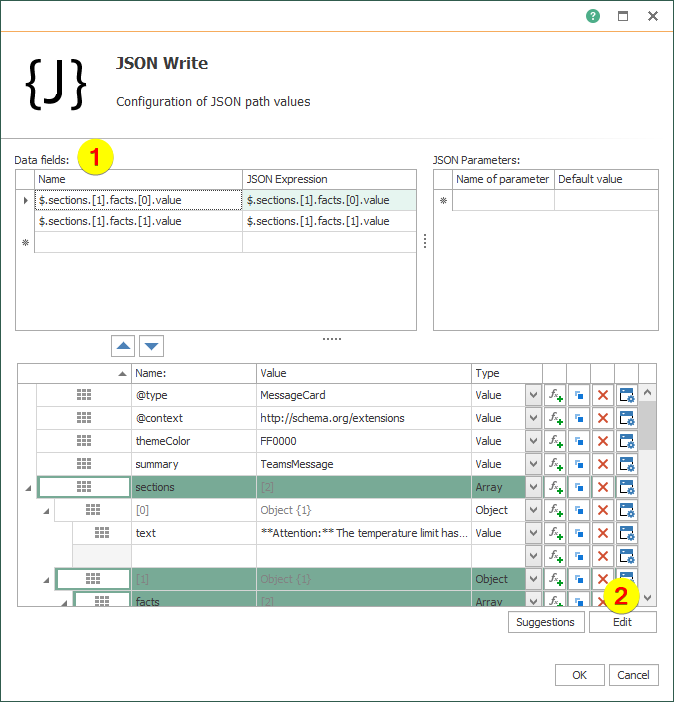 數(shù)據(jù)字段 (1) 是 JSON 塊用于從外部寫入動態(tài)值的參數(shù)。