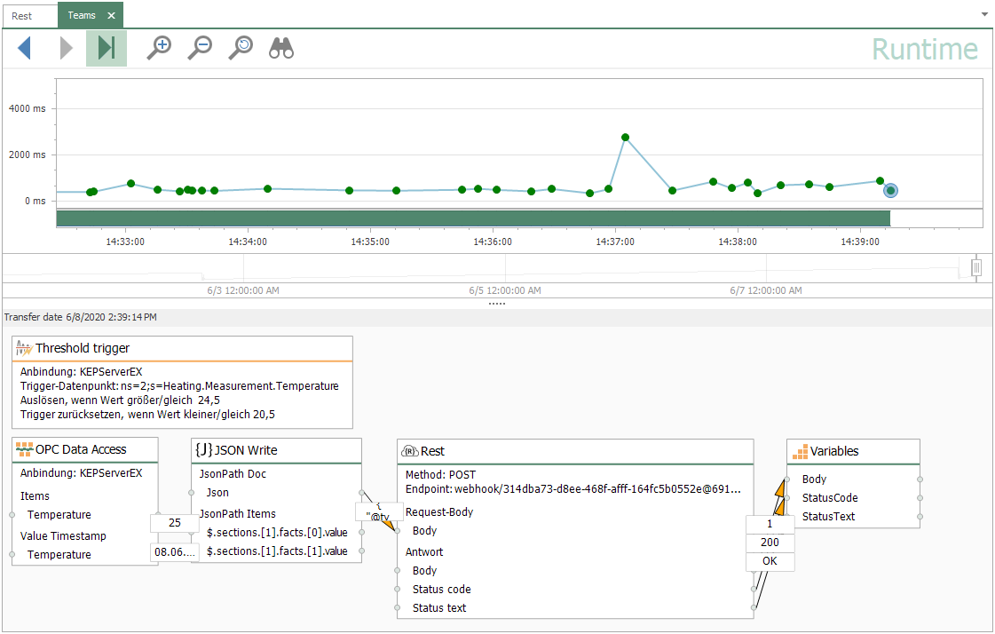 OPC Router的REST 插件允許直接向團隊發(fā)送聊天消息。因此,警報和狀態(tài)消息可以完全集成到負(fù)責(zé)人熟悉的工作環(huán)境中。除了純文本消息外, 還可以發(fā)送Web 鏈接,使收件人可以立即跳轉(zhuǎn)到生產(chǎn)系統(tǒng)中的正確位置或進行確認(rèn)。