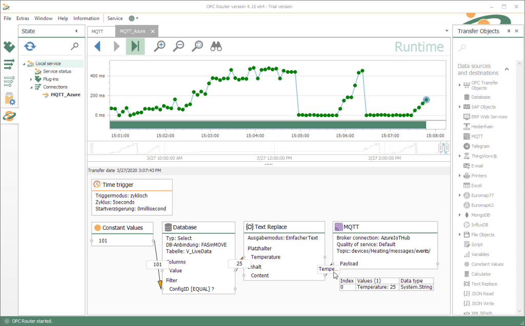 Microsoft Azure Cloud 是市場(chǎng)上領(lǐng)先的云環(huán)境之一。Azure 門戶提供了許多可以輕松連接的現(xiàn)成服務(wù)。通過(guò)互連完成的組件來(lái)創(chuàng)建云應(yīng)用程序。其中一個(gè)組件是 IoT Hub,它是外部數(shù)據(jù)源和 IoT 設(shè)備最重要的雙向連接器。使用 OPC Router,IoT 集線器和 Azure 云可以連接起來(lái),將數(shù)據(jù)寫入 Azure 云,也可以從云中獲取現(xiàn)場(chǎng)級(jí)別的數(shù)據(jù)。IoT Hub 的連接是通過(guò)OPC Router MQTT Client Plug-in實(shí)現(xiàn)的。通過(guò)OPC Router的各種插件實(shí)現(xiàn)現(xiàn)場(chǎng)級(jí)別的數(shù)據(jù)傳輸或云數(shù)據(jù)采購(gòu). 您可以通過(guò)訪問我們的教程流找到有關(guān)此主題的專用視頻。