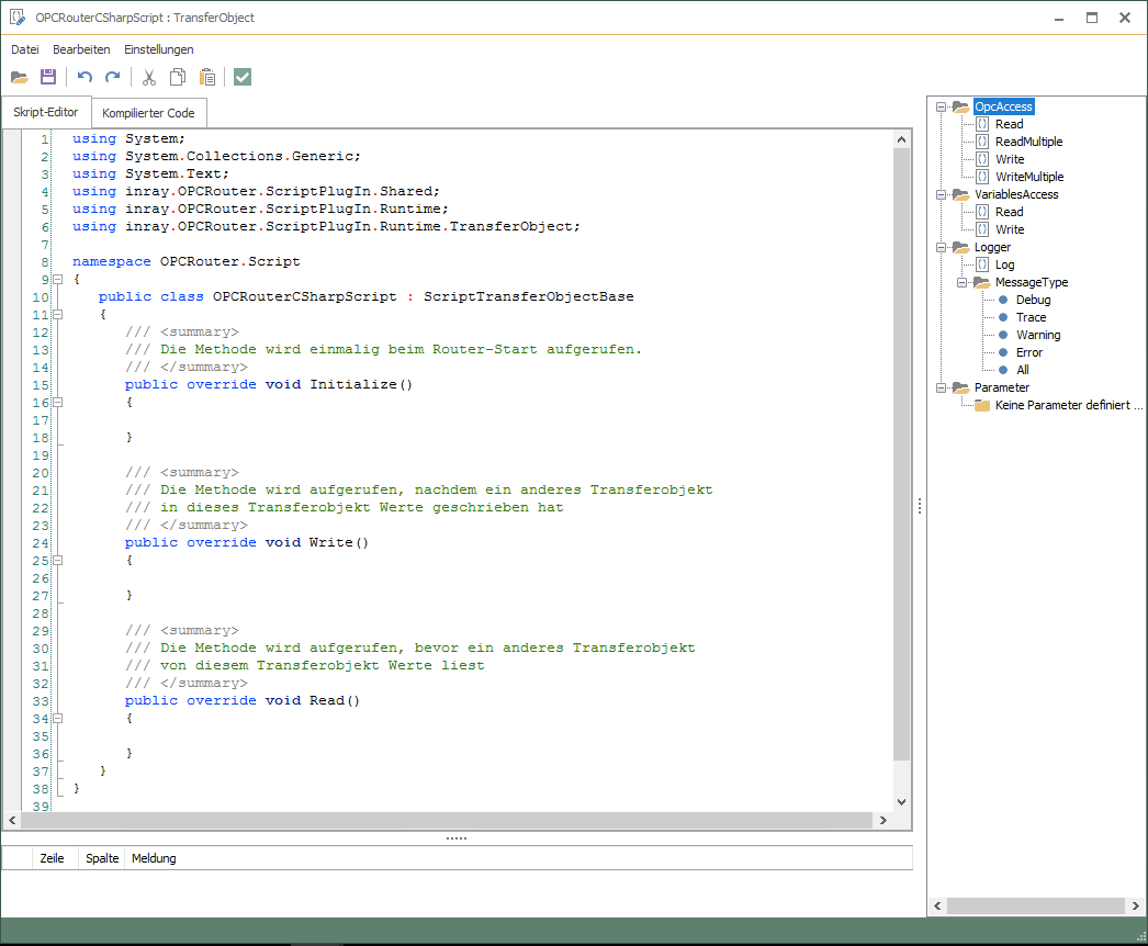 腳本編輯器可以直接在傳輸對象中打開,并允許輕松編輯相應(yīng)的腳本。編輯器提供語法高亮。一旦你編輯了你的腳本,你也可以驗證你的腳本。OPC Router的庫項目可直接訪問并以樹形結(jié)構(gòu)提供。它們已經(jīng)包含所有預(yù)定義的實現(xiàn)方法。