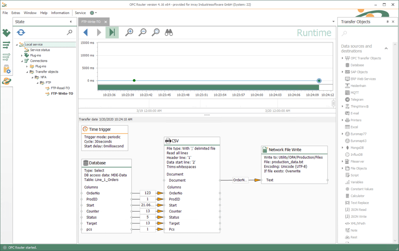 傳輸對(duì)象可用于通過 FTP 和 SMB 執(zhí)行文件交換的標(biāo)準(zhǔn)操作(讀取、寫入和刪除)。文件操作的數(shù)據(jù)可以使用默認(rèn)包含在 OPC Router中的 JSON、XML 或 CSV 傳輸對(duì)象進(jìn)行處理或生成。可以直接傳輸二進(jìn)制數(shù)據(jù)以傳輸其他插件的對(duì)象,例如將它們保存在數(shù)據(jù)庫(kù)中。