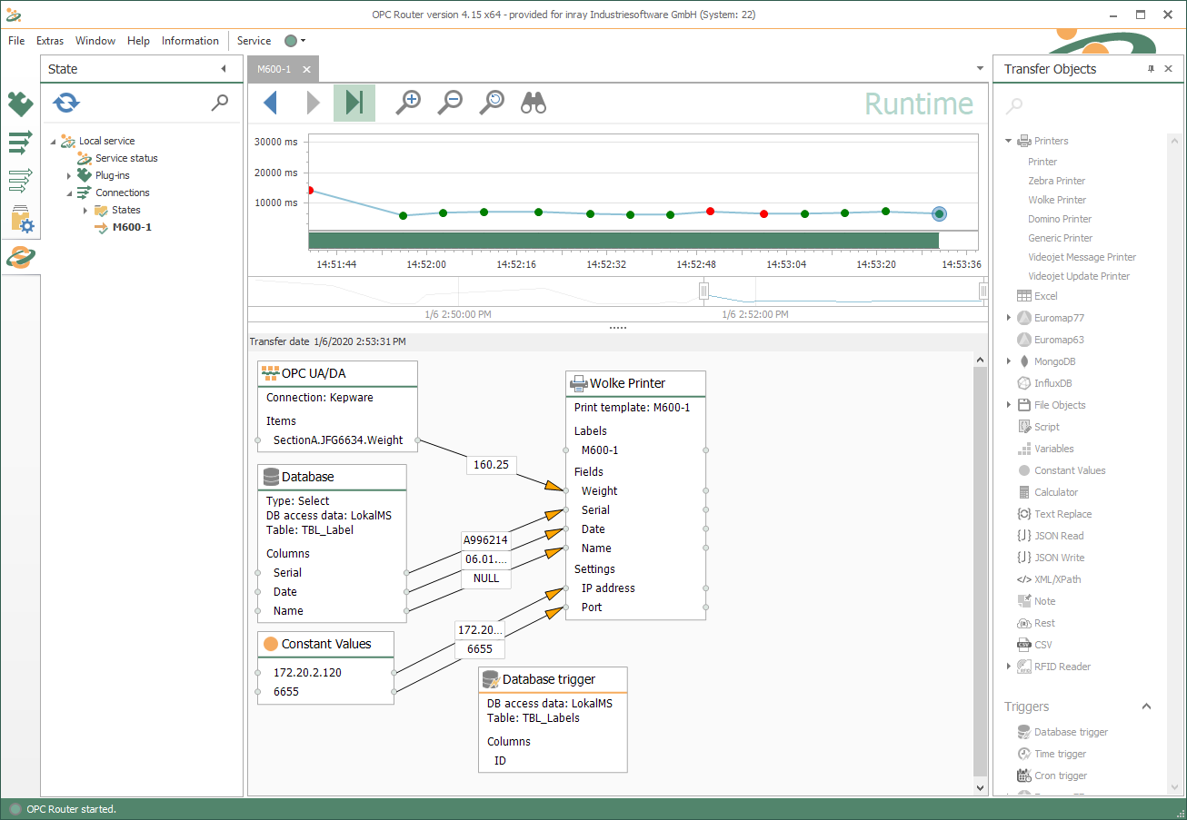 使用 Wolke 插件傳遞給 Wolke 打印機的標簽數據的來源是靈活的。 OPC Router中可用的所有插件都可以在一個連接中使用和鏈接。例如,使用 OPC UA 客戶端插件,可以直接從控制器獲取數據。這意味著貼標機可以根據當前的生產數據在過程運行時從 PLC 獲得產品貼標數據。這允許將源行、批號或機器編號等可追溯性數據應用于產品。