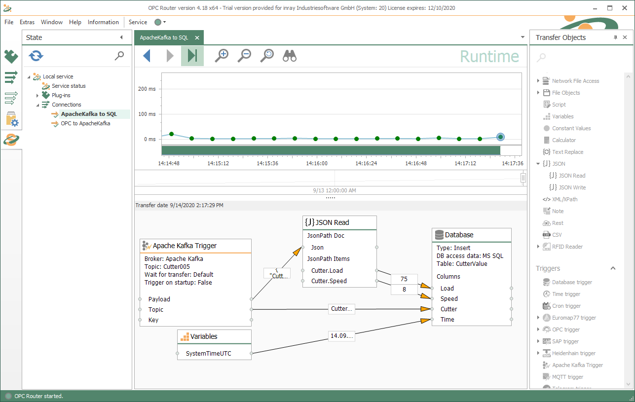 通過(guò)OPC Router使用拖放操作非常簡(jiǎn)單直觀的就可以連接到Apache Kafka數(shù)據(jù)庫(kù)這兩個(gè)屏幕截圖向您展示了 Kafka 應(yīng)用程序的示例。在第一個(gè)屏幕截圖中,在 KepServerEX 的幫助下獲取數(shù)據(jù),將其轉(zhuǎn)換為 JSON 并發(fā)送到 Apache Kafka Broker。第二個(gè)屏幕截圖顯示了如何從 Apache Kafka 接收數(shù)據(jù)、在 JSON 中進(jìn)行評(píng)估并傳輸?shù)?MS-SQL 數(shù)據(jù)庫(kù)。