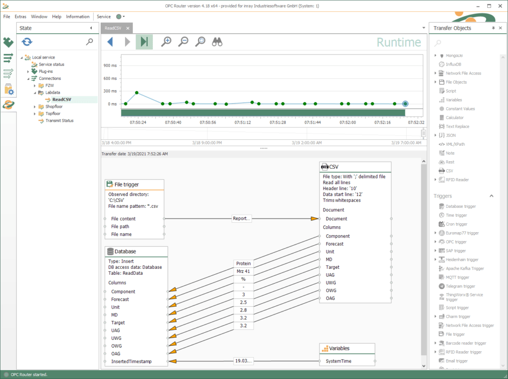 一些系統(tǒng)在運(yùn)行過程中不斷創(chuàng)建帶有過程數(shù)據(jù)的 CVS 文件。根據(jù)內(nèi)部邏輯,定期創(chuàng)建新文件(例如每小時(shí)或每天)。然后這些文件可供其他系統(tǒng)使用以接管過程數(shù)據(jù)。例如,使用 OPC Router,可以通過文件觸發(fā)器順序讀取文件并通過 CSV 對(duì)象進(jìn)行評(píng)估并傳輸?shù)?/font>數(shù)據(jù)庫(kù)。這樣就實(shí)現(xiàn)了連續(xù)自動(dòng)導(dǎo)入。