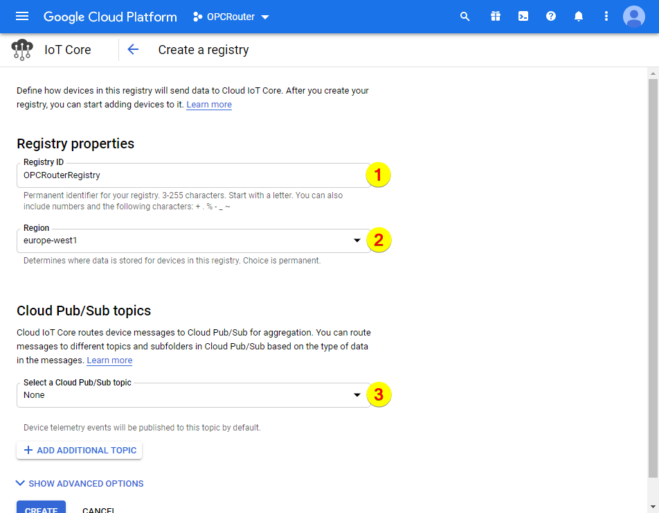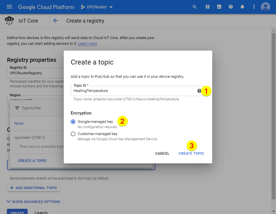 - 輸入主題 ID (1),選擇加密“Google-managed key” (2) 并點擊“CREATE TOPIC” (3):