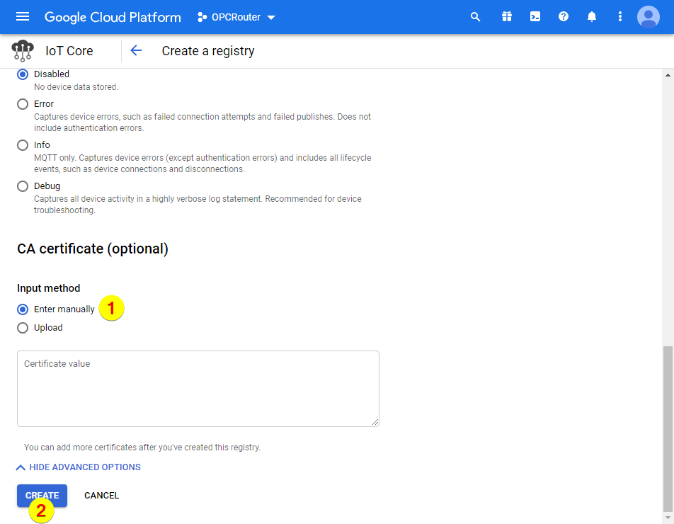 CA 證書將手動輸入 (1),然后單擊“創(chuàng)建”(2):