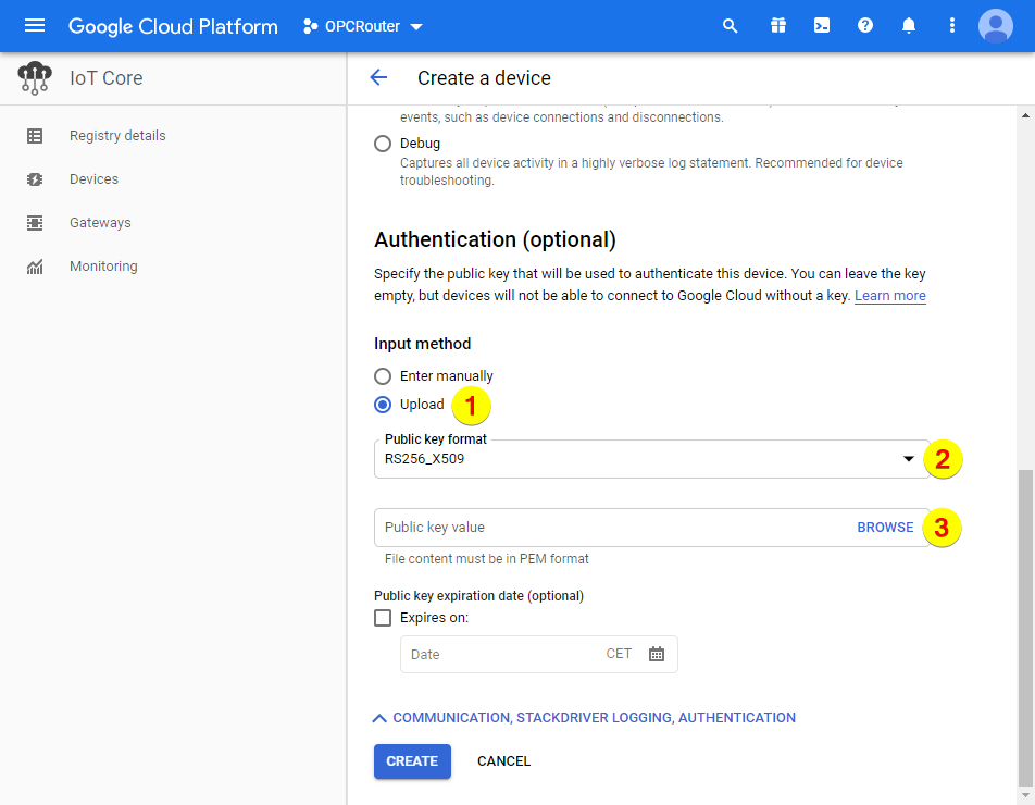 選擇輸入法“上傳”(1),使用格式“RS256_X509”(2)并點擊“瀏覽”(3):