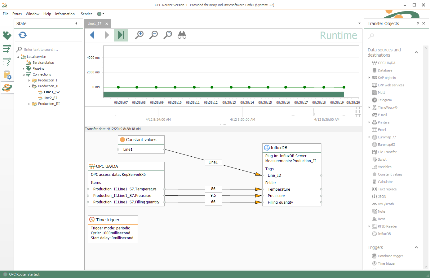 通過其插件,OPC Router可以連接到工業(yè)基礎設施中的各種系統(tǒng),因此也可以訪問它們的數(shù)據(jù)。使用 InfluxDB/InfluxDB2 插件,現(xiàn)在可以將這些數(shù)據(jù)直接傳輸?shù)?Influx 數(shù)據(jù)庫,并建立與 InfluxDB2 實例和 InfluxDB 云的連接。因此,這些數(shù)據(jù)可以提供給大數(shù)據(jù)和分析應用程序。數(shù)據(jù)源與 InfluxDB的 連接 像往常一樣通過拖放在圖形配置中完成。