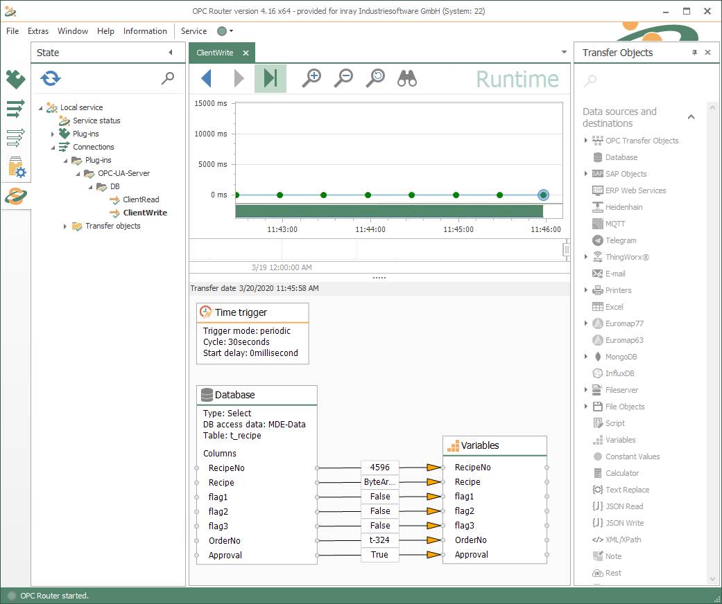 您的 OPC UA Server插件通過拖放與 OPC Router的連接非常簡單和直觀。變量在 OPC Router連接中直接填充數(shù)據(jù),然后可以通過 OPC UA 進(jìn)行查詢。之后,可以通過 OPC UA(通過 Kepware 的 OPC UA 測試客戶端)訪問 OPC Router變量。