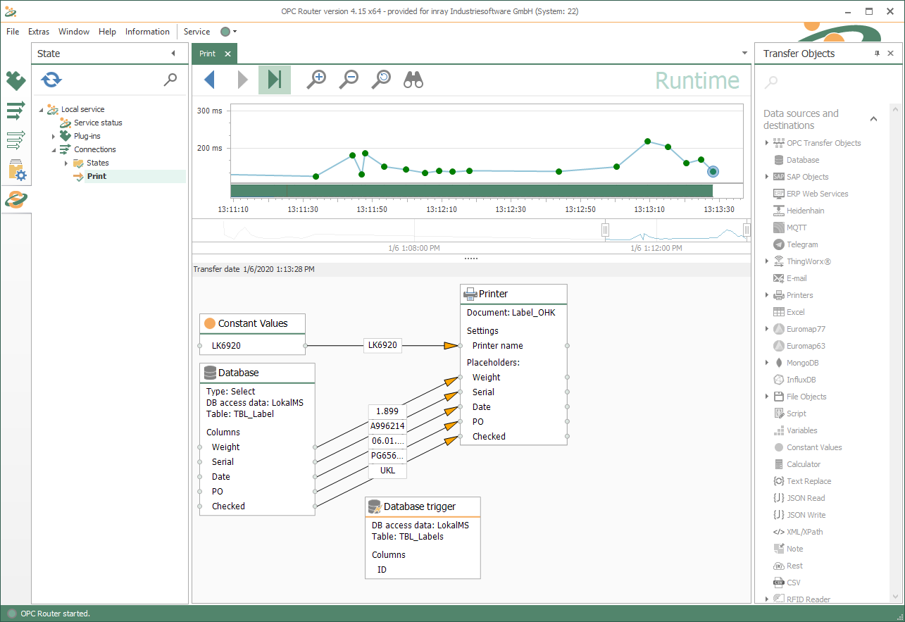 打印流程通常由生產流程觸發(fā),并通過管理系統(tǒng)(ERP、MES)轉換為打印機的打印作業(yè)。在這種類型的過程中,同步丟失的情況并不少見,并且與生產異步工作的打印機假脫機程序可能會導致打印輸出與實際生產的商品之間出現偏移。可以使用 Windows 打印機插件解決此問題。通過 REST、 SQL、 SOAP、 SAP-RFC等接口 或者類似的,OPCRouter可以直接從管理系統(tǒng)中獲取打印數據,存儲,然后根據PLC的請求直接打印,與生產的產品同步。沒有后臺處理程序問題,并且通過 PLC 和 OPC Router之間的握手絕對驗證。