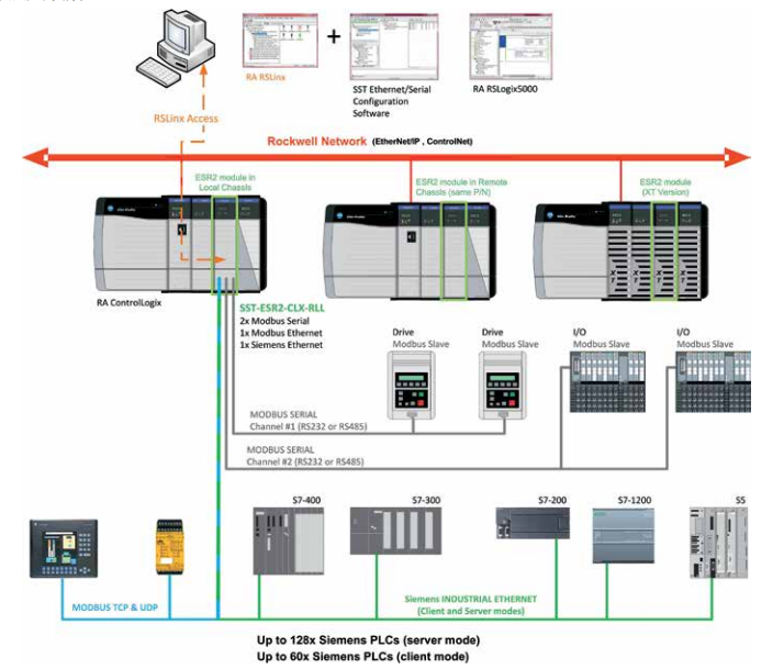 用于羅克韋爾ControlLogix的、配有1個以太網(wǎng)口+2個串口的SST通信模塊,Modbus/TCP、西門子工業(yè)以太網(wǎng)和Modbus串行協(xié)議網(wǎng)。