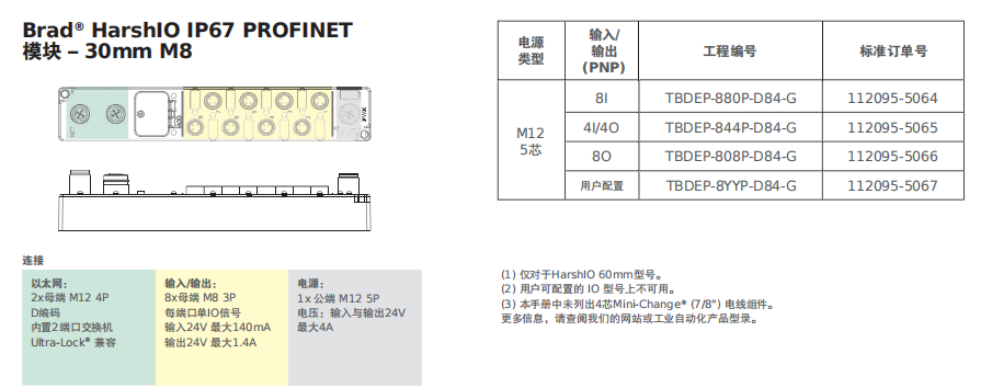 Brad? PROFINET HarshIO 模塊,惡劣環(huán)境下的 IP67 級別數(shù)字式 IO 模塊設(shè)計(jì)用于具有PROFINET-IO 通訊功能的直接機(jī)器安裝應(yīng)用。